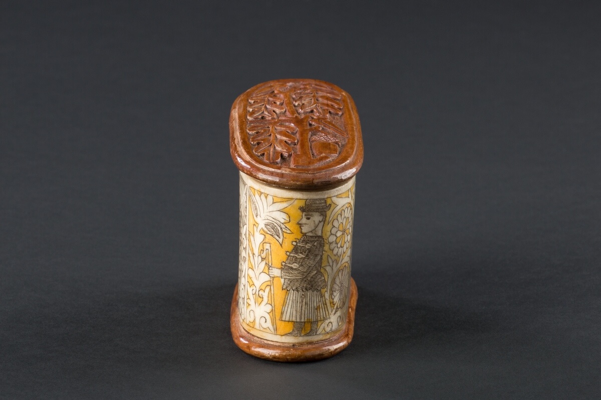 - Anyaga szaru, fedele és alja lakkozott fa. Karcolással, választóvízzel, koromlével és piros növényi festékkel díszítették. Négy mezőre osztott részén: a középső mezőben erősen stilizált, pirossal színezett magyar címer. A címert mindkét oldalán sűrű, leveles ág veszi körül, amely felső végében elhegyesedő, nagyobb levelekben végződik. A levelek alatt szabadon hagyott részt erősen stilizált növényi díszítéssel töltötték ki. A címer ellenkező oldalán egészen szimmetrikus, erősen stilizált virág- és levéldíszítésű fácska van. A két szélén, az egyik oldalon juhászkampót tartó pásztoralak, mindkét oldalán virágos ágacskával, a másik oldalán egy pillangós főkötős menyecske áll, bal kezében egy erősen stilizált csokrot tart. A női alak lábszárai és lába hiányzik. A sótartó alsó lapja sima lapos, keskeny, kiálló peremmel. A felső része kis tölgyfa lombocskát ábrázol. A felső részén két szembenálló galambbal. Ez a díszítés domború és teljesen naturális. Ellentétben áll a csontkarcolás stílusával. Formája a szokásos sótartó forma. A növénydíszítésnél a szaru kissé nyomott.