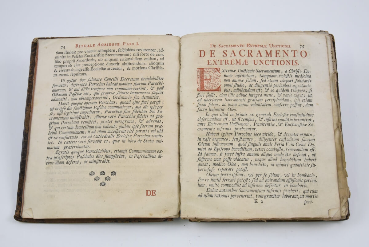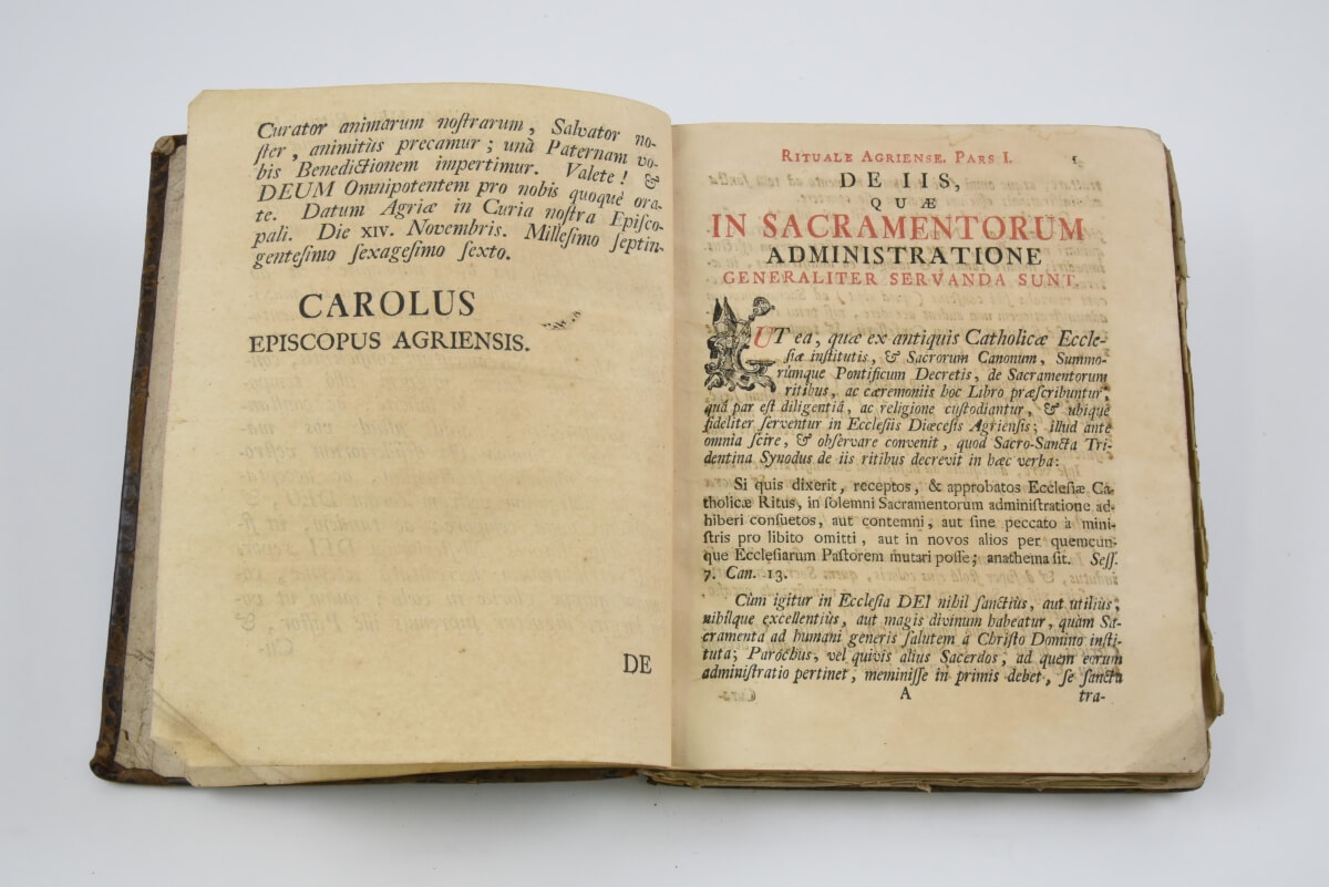 - Az egyetemépítő egri püspök, Eszterházy Károly Egerben megjelent munkája. A rituále liturgikus könyvműfaj, mely a plébánosok profán tömörséggel fogalmazott gyakorlati „zsebkönyve”. A miséhez és zsolozsmához nem kötődő (és így nagyobbrészt az egyházi év körforgásától is független) nyilvános istentiszteleti alkalmak rendjét közlő gyűjtemény. Ez a plébánosi kézikönyv nem tartalmazza a püspöknek fenntartott szentség kiszolgáltatásokat és áldásokat, csakis azokat, melyekhez az áldozópap közreműködése elégséges. A kiállított kötet Eszterházy Károly egri püspök liturgikus könyve. Ennek a speciális kiadásnak különleges egyházpolitikai jelentősége volt az egri egyházmegyében: Eszterházy Károly püspök ugyanis a jelek szerint egy mintaszerű rituále összeállításával és a papság rendelkezésére bocsátásával többek közt azt kívánta demonstrálni, hogy az egyházmegye képes ellátni a magyar, a német és a „szláv” ajkú hívek lelki szükségleteit is, nem szükséges tehát a legutóbbiakat önálló rítuspüspökségbe tömöríteni.