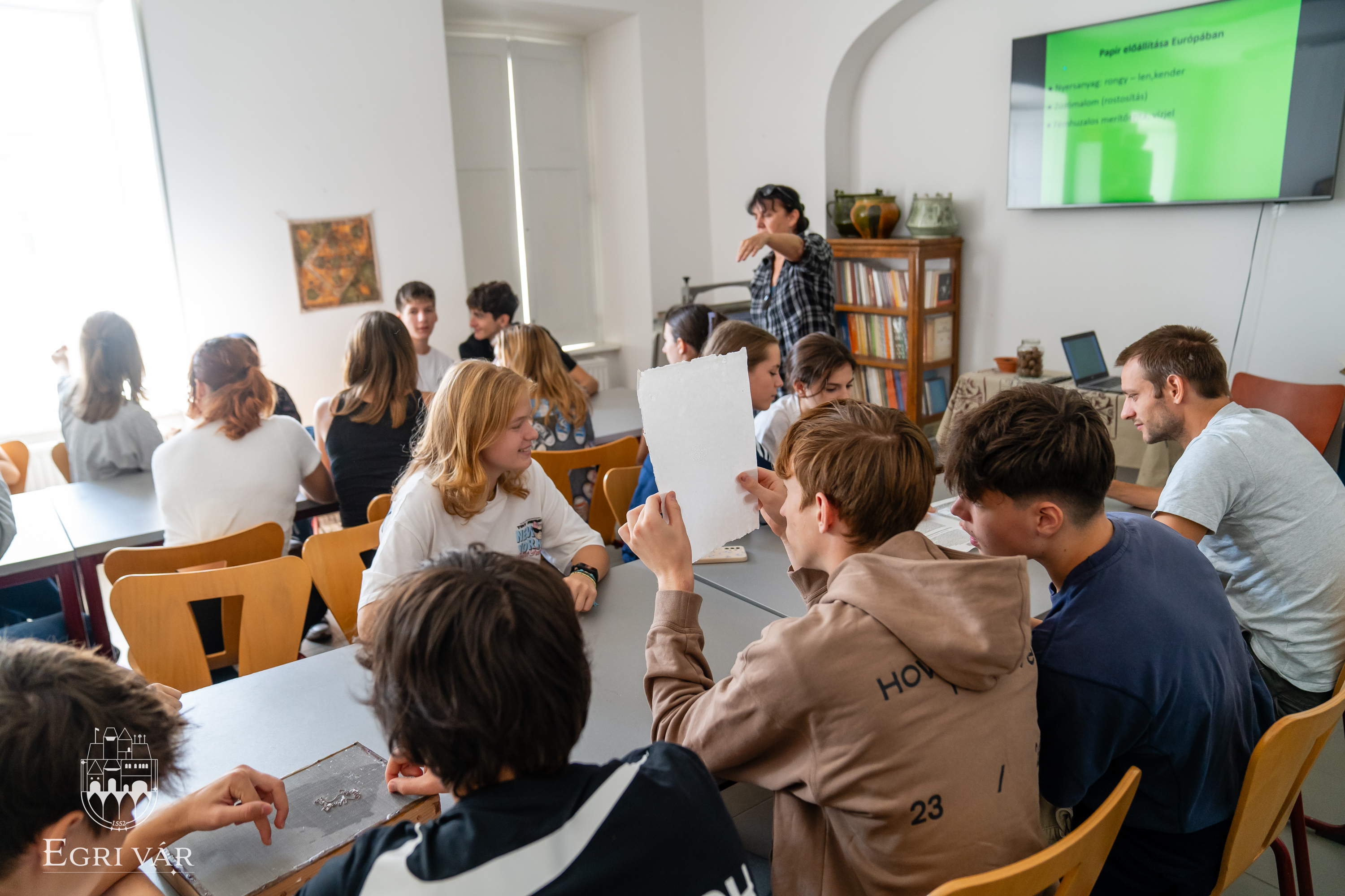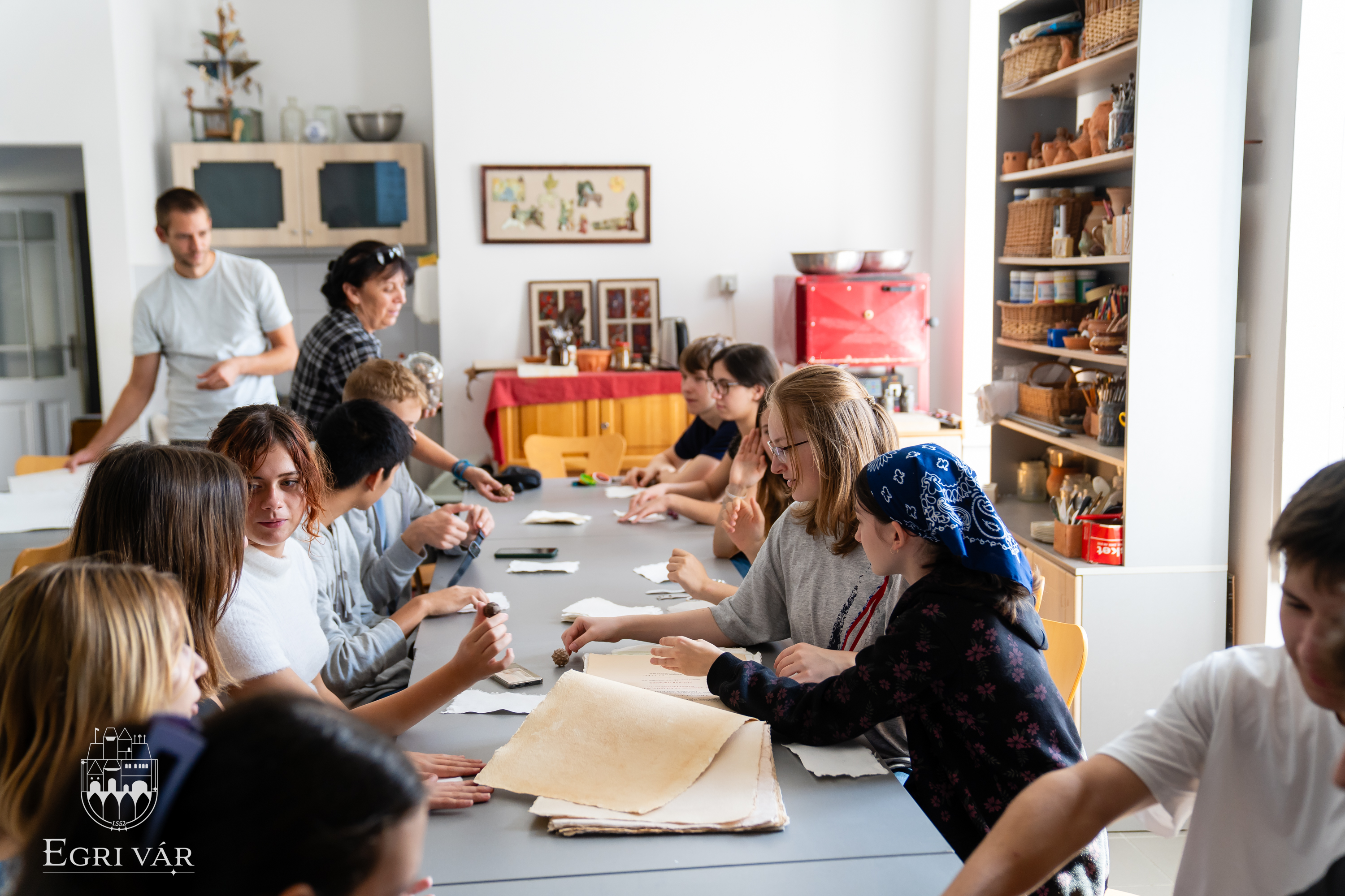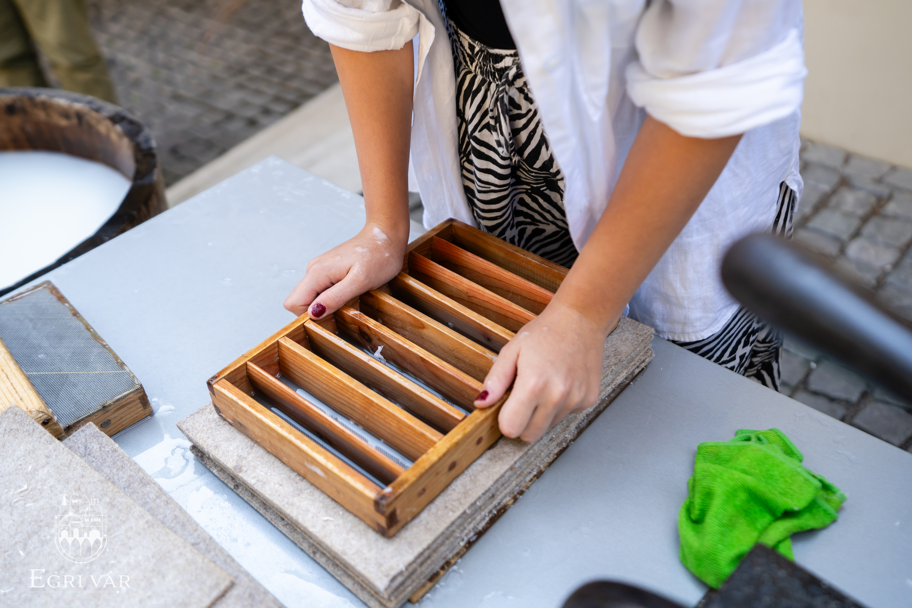 Az óra második felében a résztvevő gyermekek hagyományos eljárással saját kezűleg merítenek papírt.