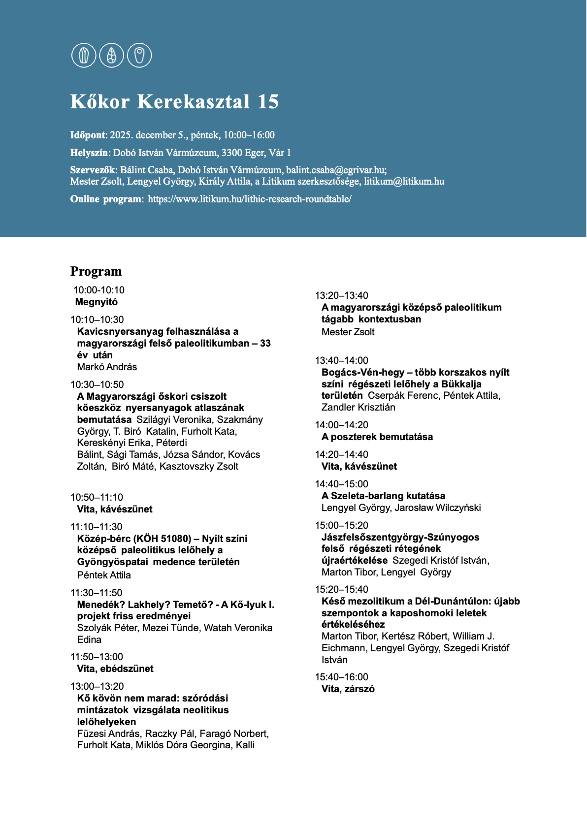A Dobó István Vármúzeum és a Litikum – a Kőkor Kerekasztal Folyóiratának szerkesztősége idén, 2025. december 5-én, az egri vár Dobó-bástyájának konferenciatermében szervezi meg a 15. Kőkor Kerekasztalt, a régészeti korú kőeszközökkel foglalkozó magyar szakemberek éves konferenciáját.