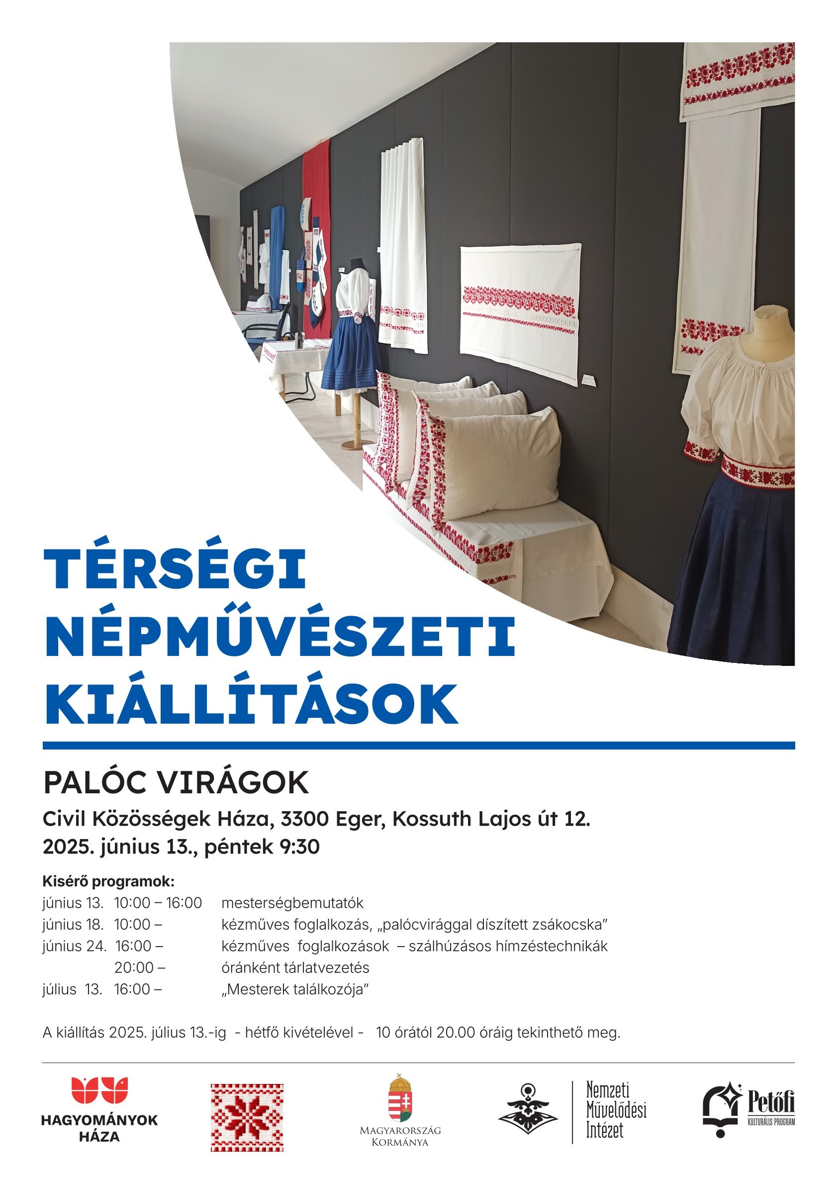 Térségi Népművészeti Kiállítások keretében június 13-án Palócvirágok címmel nyílt kiállítás az egri Civil Közösségek Házában (Eger, Kossuth Lajos út 12.). A kiállítást megnyitotta Császi Irén, a Dobó István Vármúzeum etnográfus-főmuzeológusa. A kiállítás a Közösségi szőttes konferencia nyitó rendezvénye volt, amit előadások és kerekasztalbeszélgetések követtek, melynek Partneri együttműködések szekciójához, térségünk népművészetét érintő kérdések megvitatásához a Dobó István Vármúzeum etnográfus-főmuzeológusa, Zábrátzky Éva is hozzájárult.