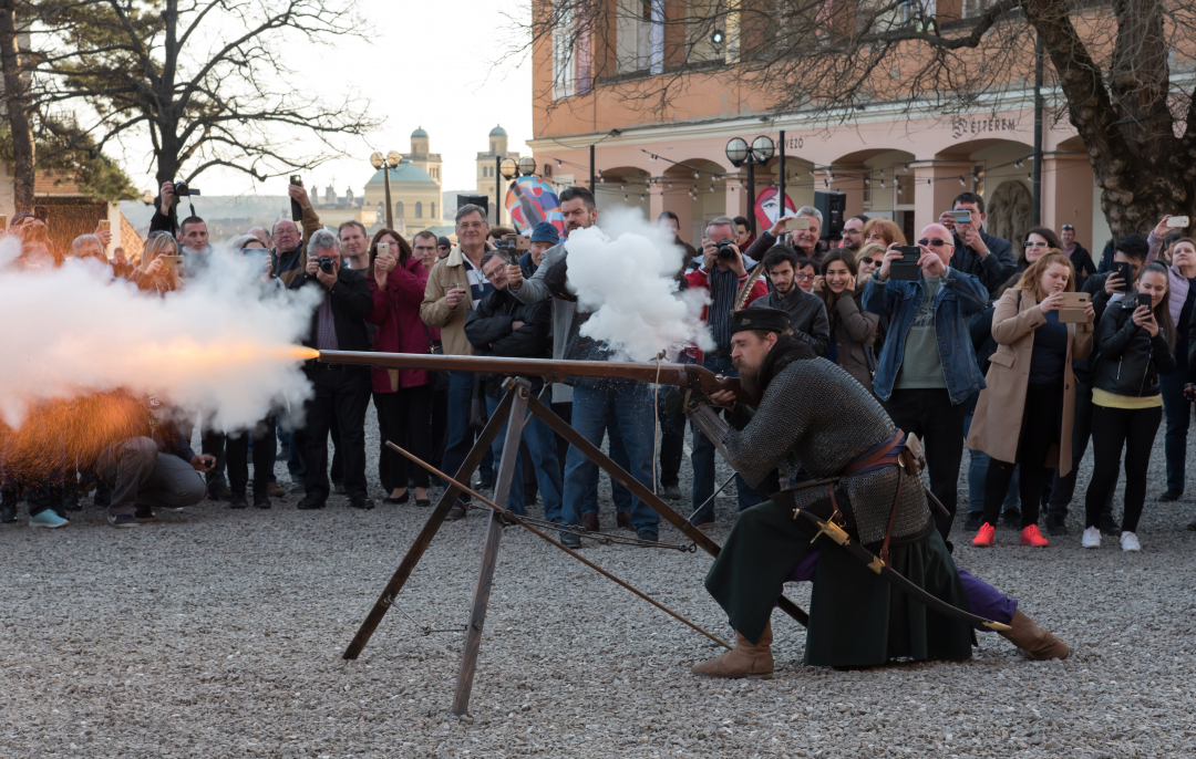 A díszlövést egy 16. századi szakállas puskával adják le.