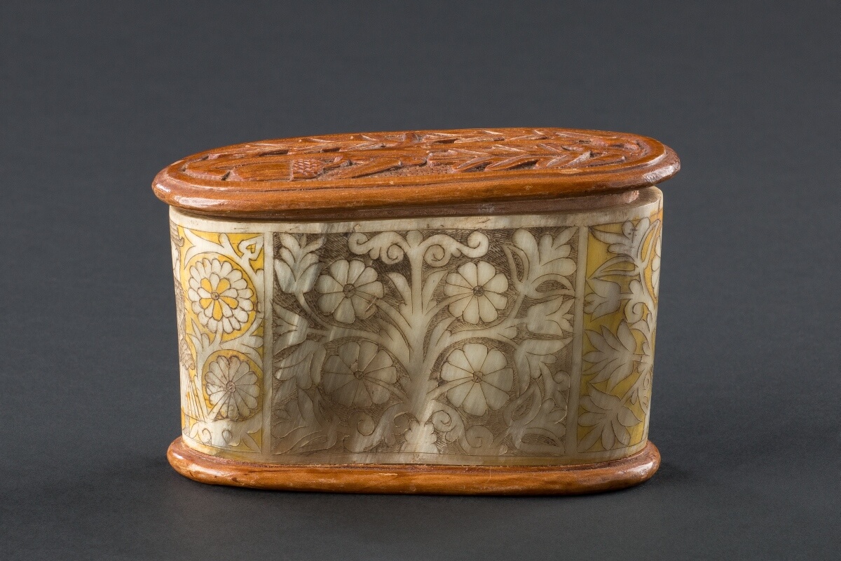- Anyaga szaru, fedele és alja lakkozott fa. Karcolással, választóvízzel, koromlével és piros növényi festékkel díszítették. Négy mezőre osztott részén: a középső mezőben erősen stilizált, pirossal színezett magyar címer. A címert mindkét oldalán sűrű, leveles ág veszi körül, amely felső végében elhegyesedő, nagyobb levelekben végződik. A levelek alatt szabadon hagyott részt erősen stilizált növényi díszítéssel töltötték ki. A címer ellenkező oldalán egészen szimmetrikus, erősen stilizált virág- és levéldíszítésű fácska van. A két szélén, az egyik oldalon juhászkampót tartó pásztoralak, mindkét oldalán virágos ágacskával, a másik oldalán egy pillangós főkötős menyecske áll, bal kezében egy erősen stilizált csokrot tart. A női alak lábszárai és lába hiányzik. A sótartó alsó lapja sima lapos, keskeny, kiálló peremmel. A felső része kis tölgyfa lombocskát ábrázol. A felső részén két szembenálló galambbal. Ez a díszítés domború és teljesen naturális. Ellentétben áll a csontkarcolás stílusával. Formája a szokásos sótartó forma. A növénydíszítésnél a szaru kissé nyomott.