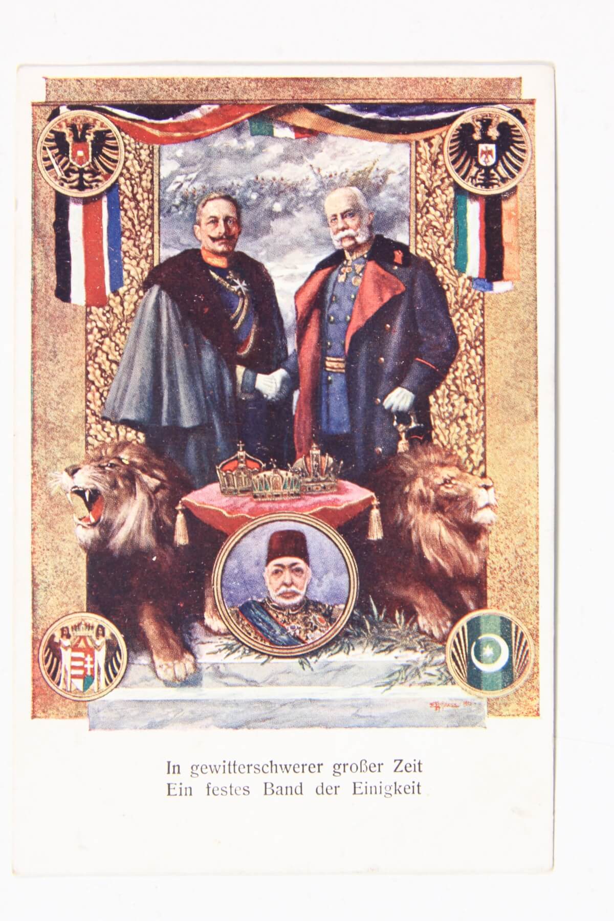 Az első világháború idején a képeslapok képes oldala is nagy jelentőségre tett szert, a tömegtájékoztatás és a propaganda egyik hatásos eszközeként használták. A nagyobb, főként a Bécsben működő kiadóvállalatok több lapból álló színes sorozatokat adtak ki, amelyek a háború egyes eseményeit, elsősorban a győzelmes harcokat mutatták be. A karikaturisztikus jellegű grafikákon az ellenséges katonákat mindig negatív színben tüntették fel, míg a magyar, osztrák, német katonák ábrázolásakor azok bátorságát, hősiességét hangsúlyozták. Rengeteg képeslap készült Ferenc József császárról és az 1916 decemberében trónra lépett IV. Károly királyról, valamint – a háborús propaganda részeként, a központi hatalmak egységét szimbolizálva – a szövetséges államok uralkodóiról is. Háborús hadszínterek jelennek meg az Érdekes Újság által kiírt hadifotó pályázatra beérkezett fekete-fehér fényképek alapján készült képeslapsorozatokon, ez utóbbiakból származó bevételeket karitatív célokra, a hadi özvegyek és árvák támogatására fordították.