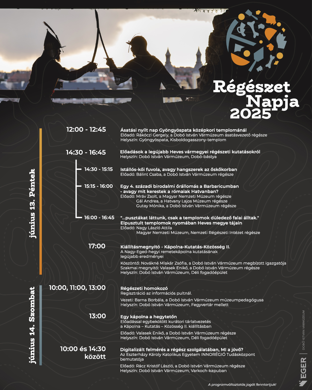 A rendezvénysorozat célja, hogy bemutathassuk a szakma képviselőinek és az érdeklődő nagyközönségnek az elmúlt időszak tudományos munkáit, a lelőhelyek és leletek felfedezésétől a tudományos feldolgozásig. A Dobó István Vármúzeum 2025. június 13-14-e között több helyszínen, izgalmas, interaktív programokkal, kiállítás megnyitóval, előadásokkal várja az érdeklődőket.
