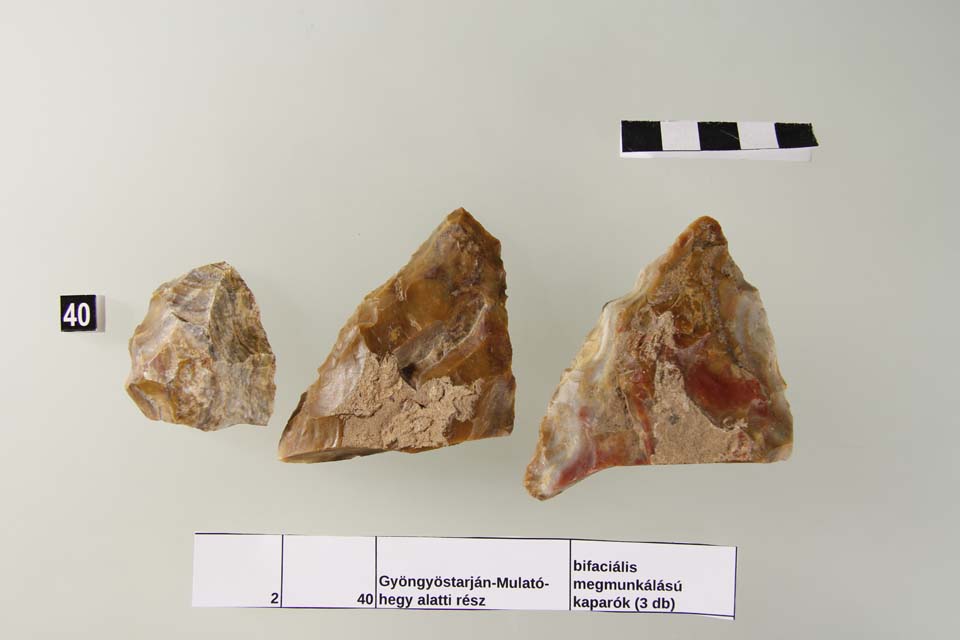 Kiállításunkban a neandervölgyi emberhez köthető, középső paleolitikus jellegű, Micoquien- vagy korai Szeletien-kultúrához tartozó, kétoldali megmunkálású, levél alakú hegyeket, kaparókat és kaparókéseket mutatunk be Gyöngyöstarján, Gyöngyösoroszi és Gyöngyöspata települések környezetéből. A modern ember felső paleolitikus jellegű Aurignacien eszközeit (magas vakarók, orros vakarók, többszörös élű vésők, retusált pengék) valamint Gravettien és Epigravettien eszközeit (hegyek, tompított hátú pengék, lamellák, vésők, pengevakarók, csonkított darabok) a Zagyva-folyó közép magas teraszairól és a Mátra-hegység vidékéről válogattuk össze.